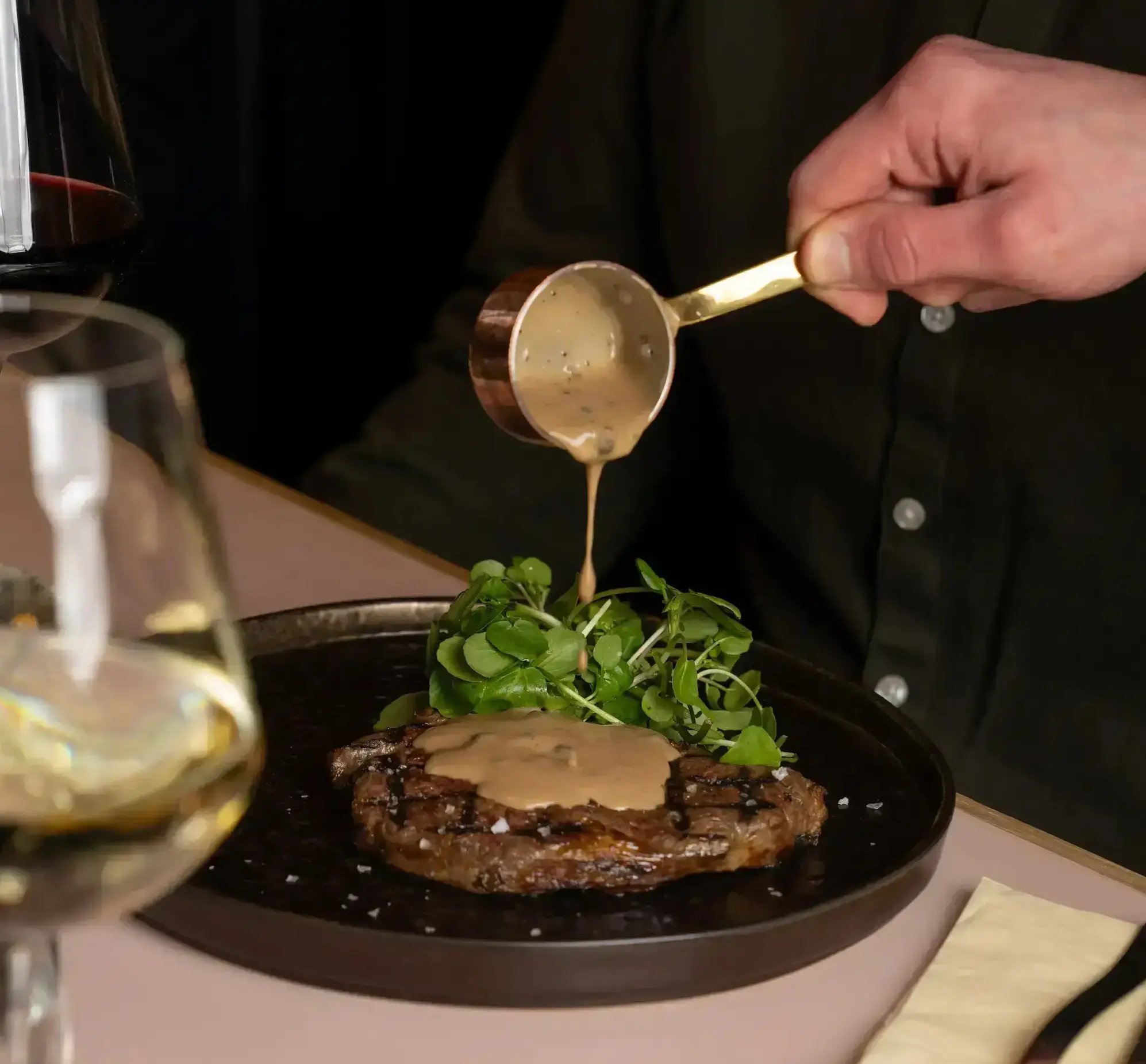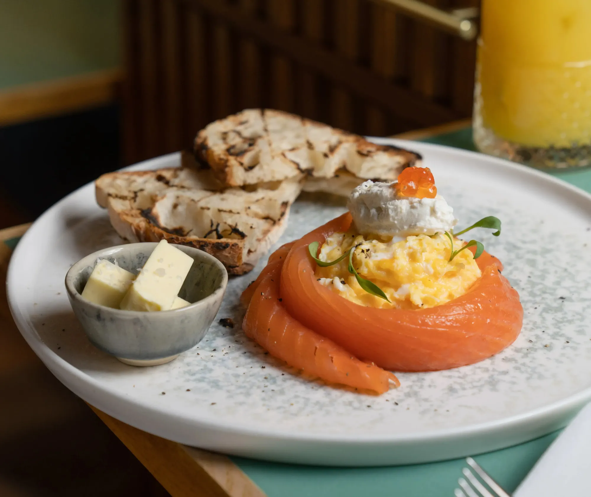 The daytime menu is served until 4pm and includes brunch dishes such as poached eggs with smashed avocado and feta; scrambled eggs with smoked salmon, whipped ricotta and caviar; and buttermilk pancakes with dulce de leche, caramelised banana and hazelnuts.