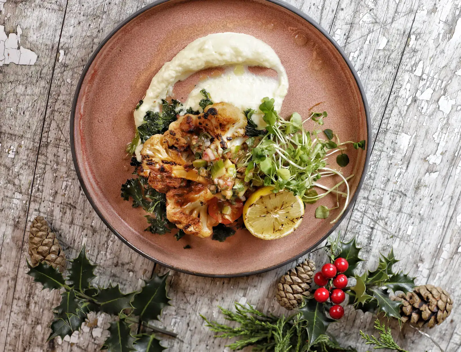 Topped with a kale salad, creamy celeriac puree, and a zesty pico de gallo salsa