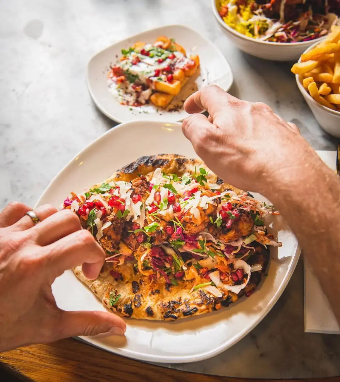 There's a range of delicious Middle-Eastern mezze dishes to start, such as chargrilled garlic Za'atar flatbread, sweet potato hummus, spiced honey halloumi fries and chicken wings with sticky sumac & date molasses.