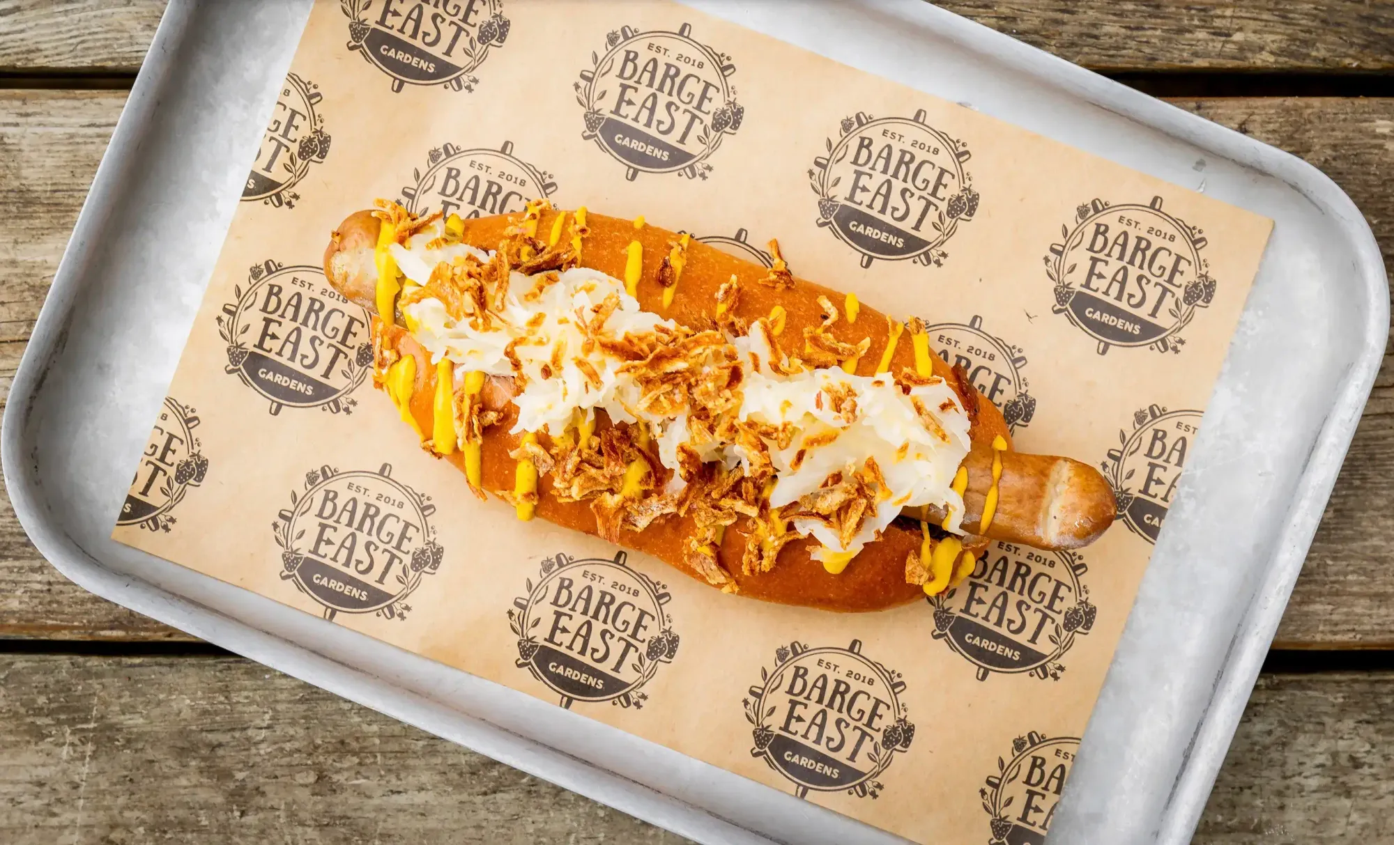 - Hot dog - Ethical butcher free-range pork frankfurter, caramelised onion, crispy shallots, mustard, sauerkraut & a milk bun