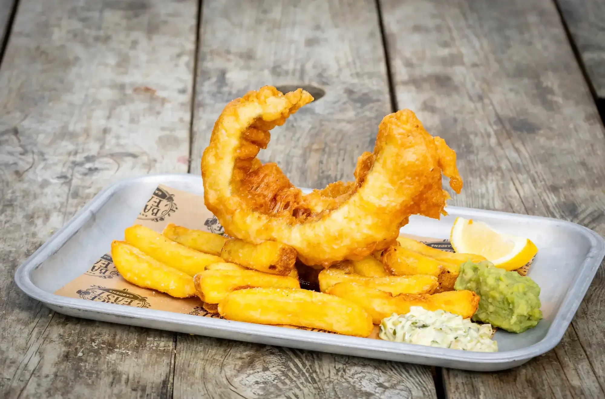 - Fish & chips - Beer battered Cornish haddock, chunky chips, mushy peas, tartare sauce