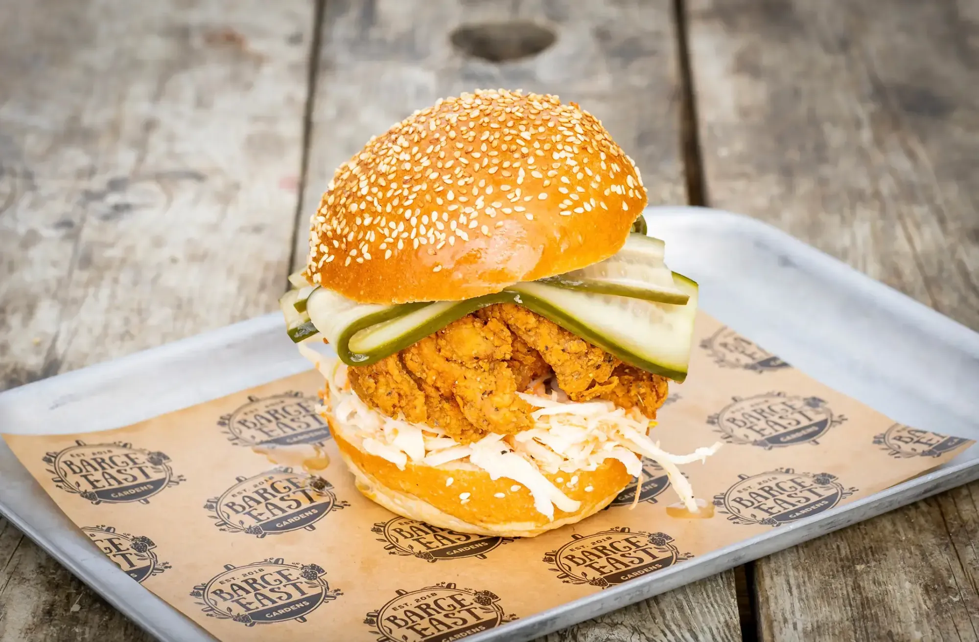 - Chicken burger - Pasture-fed chicken burger, slaw, pickled cucumber, sesame seed brioche bun