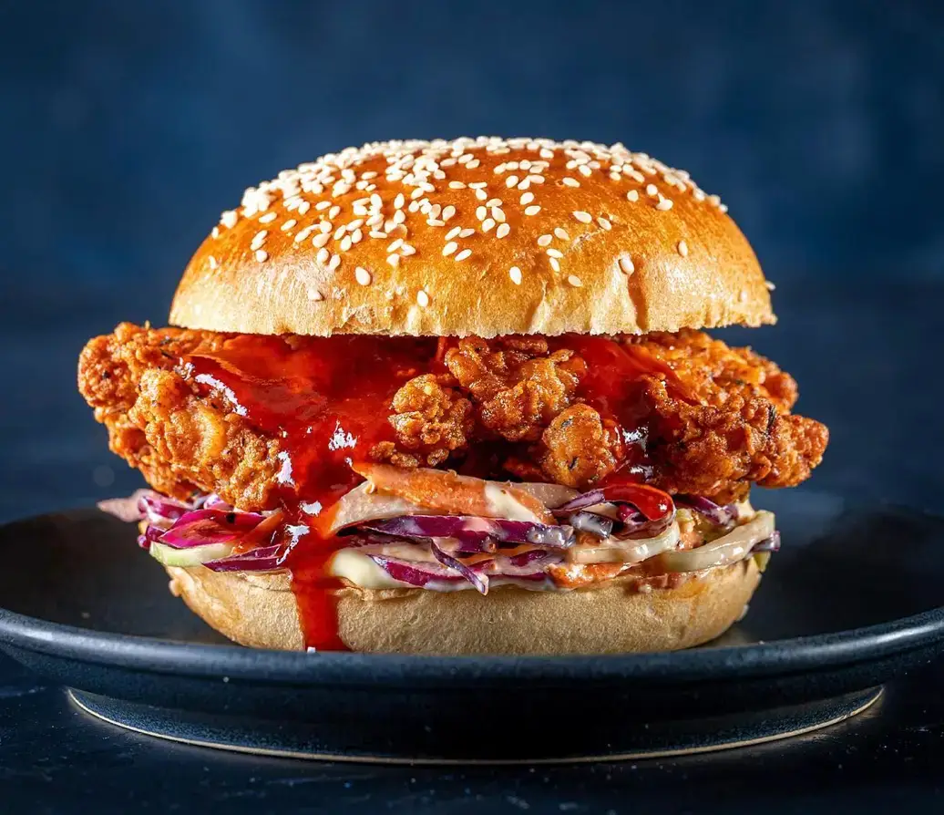 Crispy Fried Chicken burger with gochujang, sesame slaw and organic mayonnaise on seeded brioche