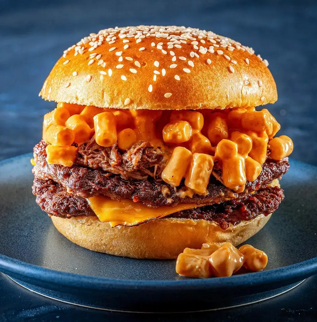 Double dry aged steak burger topped with pulled beef short rib, mac & cheese and espresso-spiked BBQ sauce on seeded brioche
