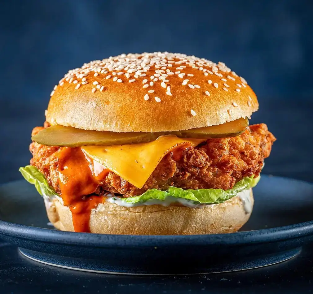 Crispy Fried Chicken burger with American cheese, cos lettuce, pickles, Buffalo hot sauce and Buttermilk ranch on seeded brioche