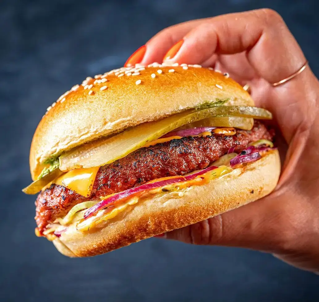 Miami plant-based patty with vegan cheese, sesame slaw, vegan mayo and house relish on soft seeded bun