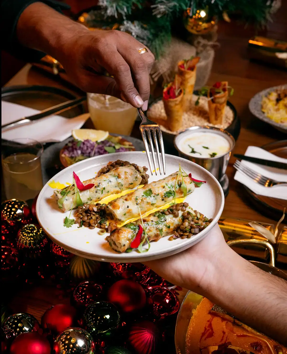 To finish, indulge in sweet treats like Rasmalai Tiramisu, Spiced Chocolate Brownie, and Parle G Biscuit Cheesecake.