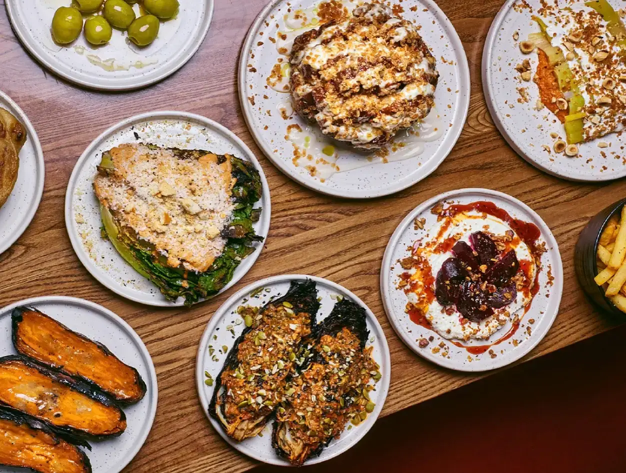 From the live-fire grill, you'll find larger plates like 35-day aged bavette steak, Iberico pork chop, Za'atar lamb cutlets, butterflied sea bream, and fire-roasted whole cauliflower glazed with black garlic & red miso.