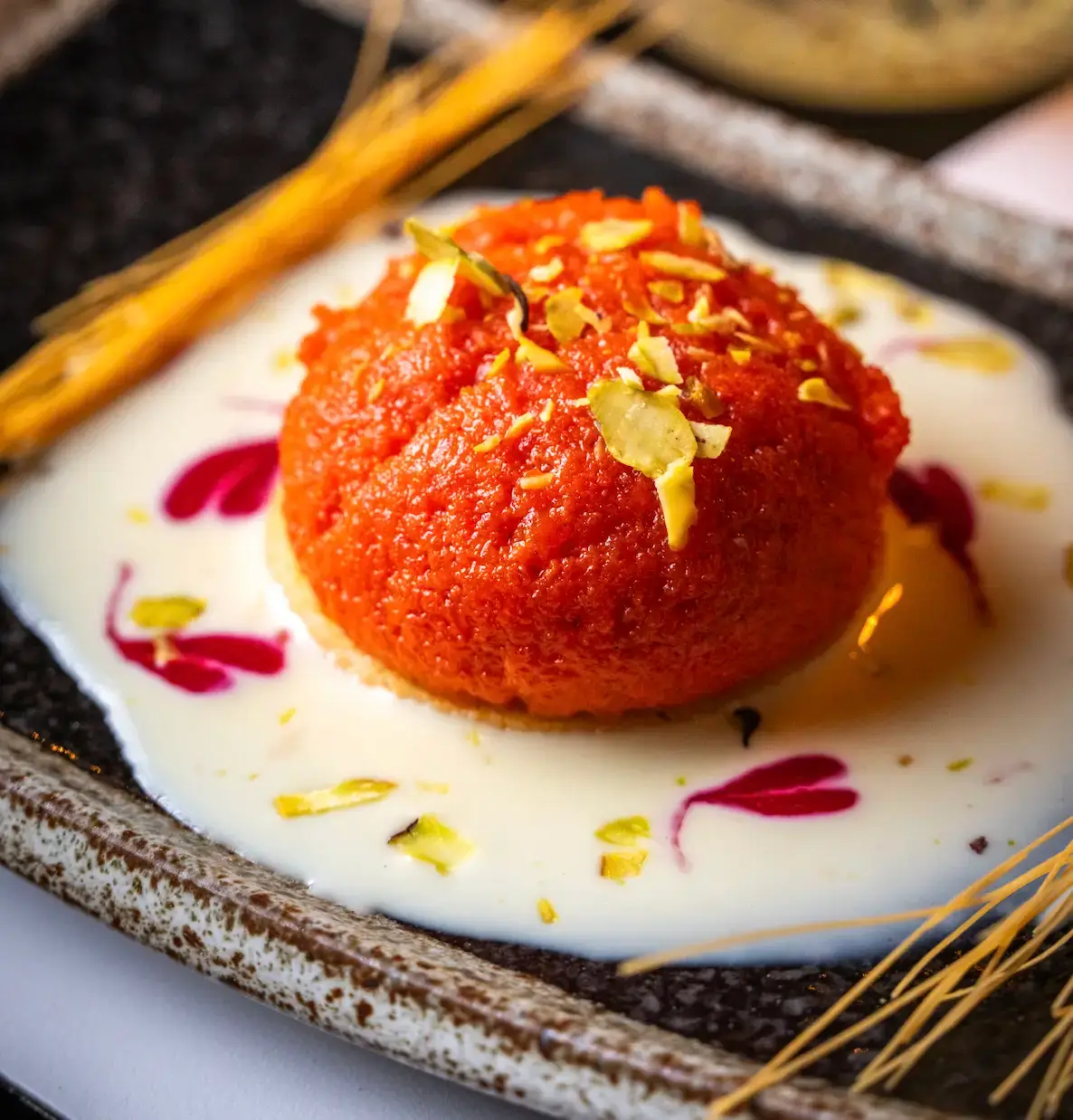 Finish your meal with traditional Indian desserts including Gulab Jamun (fried dough balls soaked in sweet, sticky syrup), a Mango Srikhand Fruit Cup (with layers of fresh berries, fresh mango and ginger crumble), and Gajjar Halwa (a sweet, condensed-milk-based dessert with caramelised carrots).