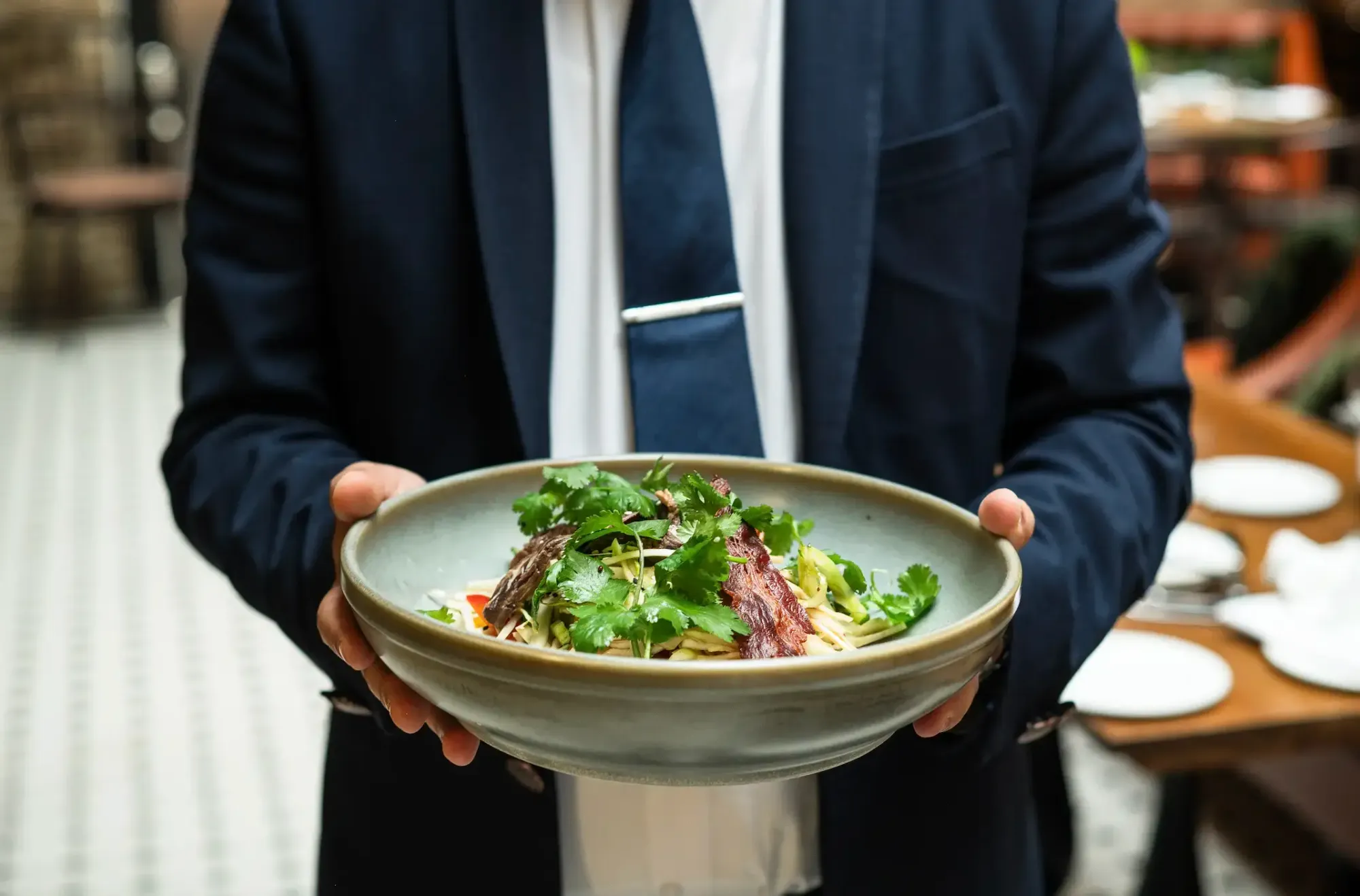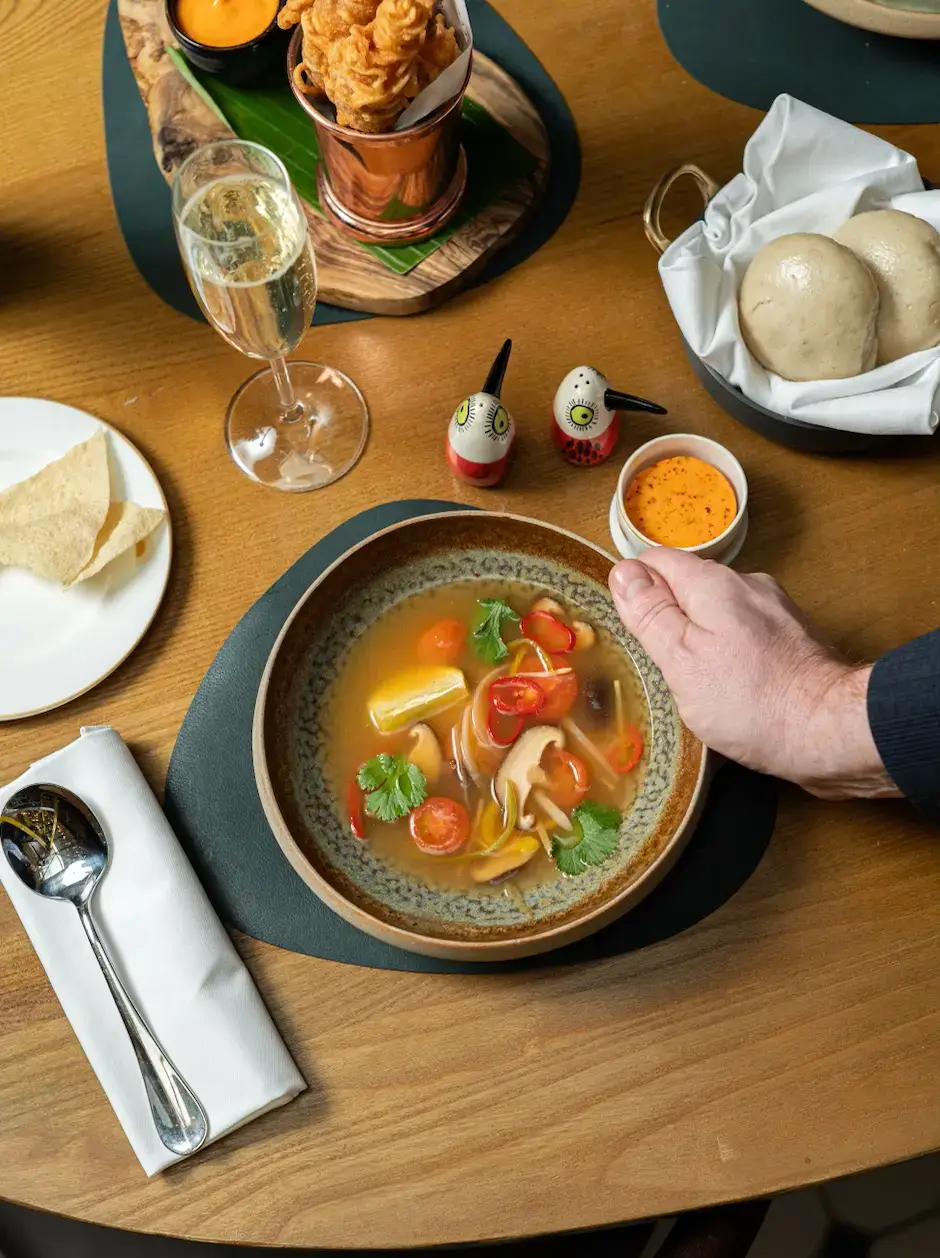 Begin your meal with starters including hot and sour soup "Tom Yum Goong", beef shin & bone marrow bao buns, chicken satay skewers, crispy prawns and scallop tartare.