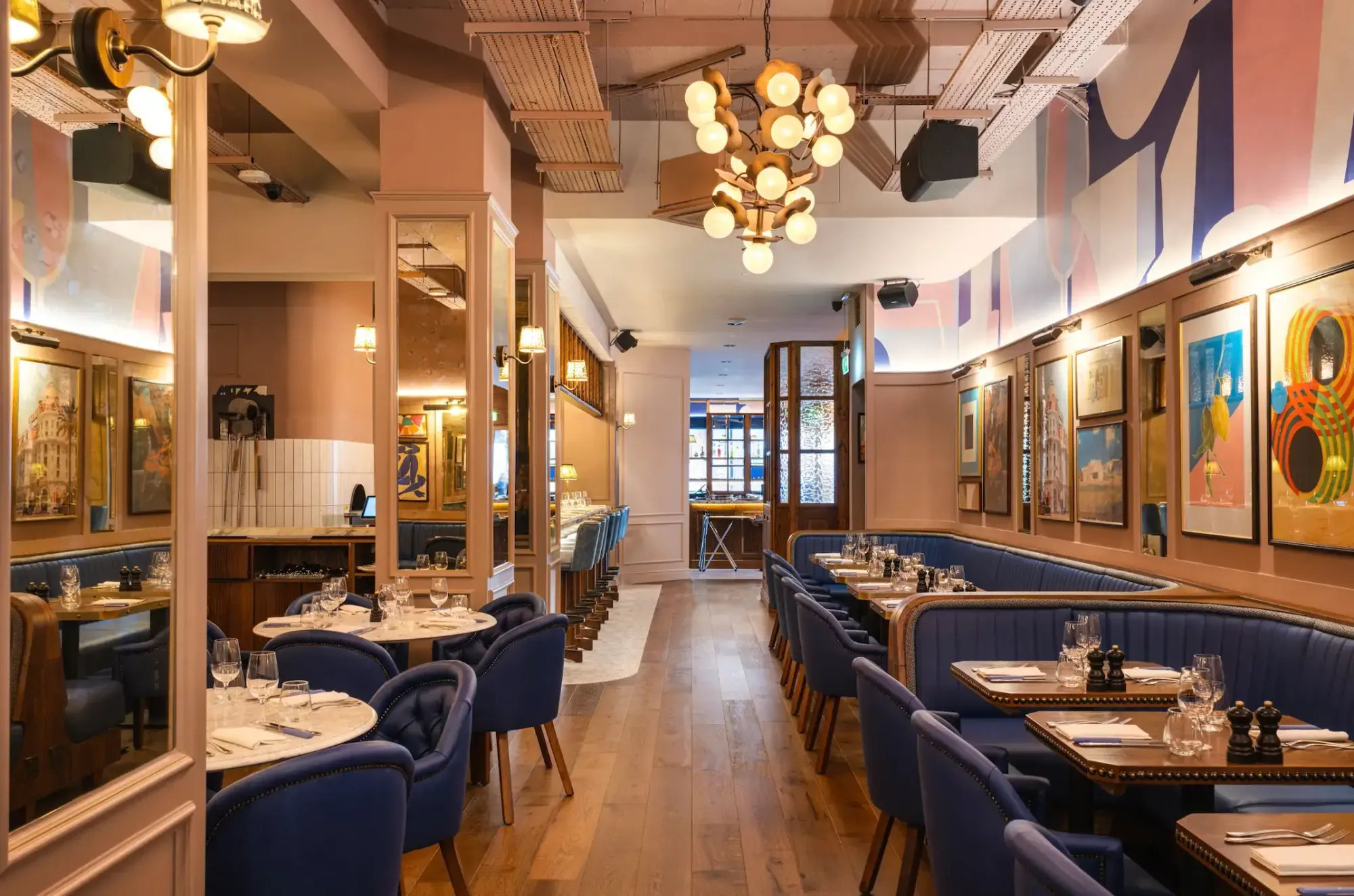 The restaurant exudes timeless elegance, featuring navy banquette seating, white marble tabletops, and wood-panelled walls adorned with eye-catching artwork.