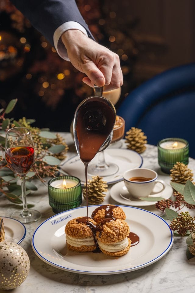 To finish, indulge in handcrafted patisserie and viennoiserie served from the dessert trolley, alongside speciality coffees and Parisian-style hot chocolate topped with Chantilly cream.