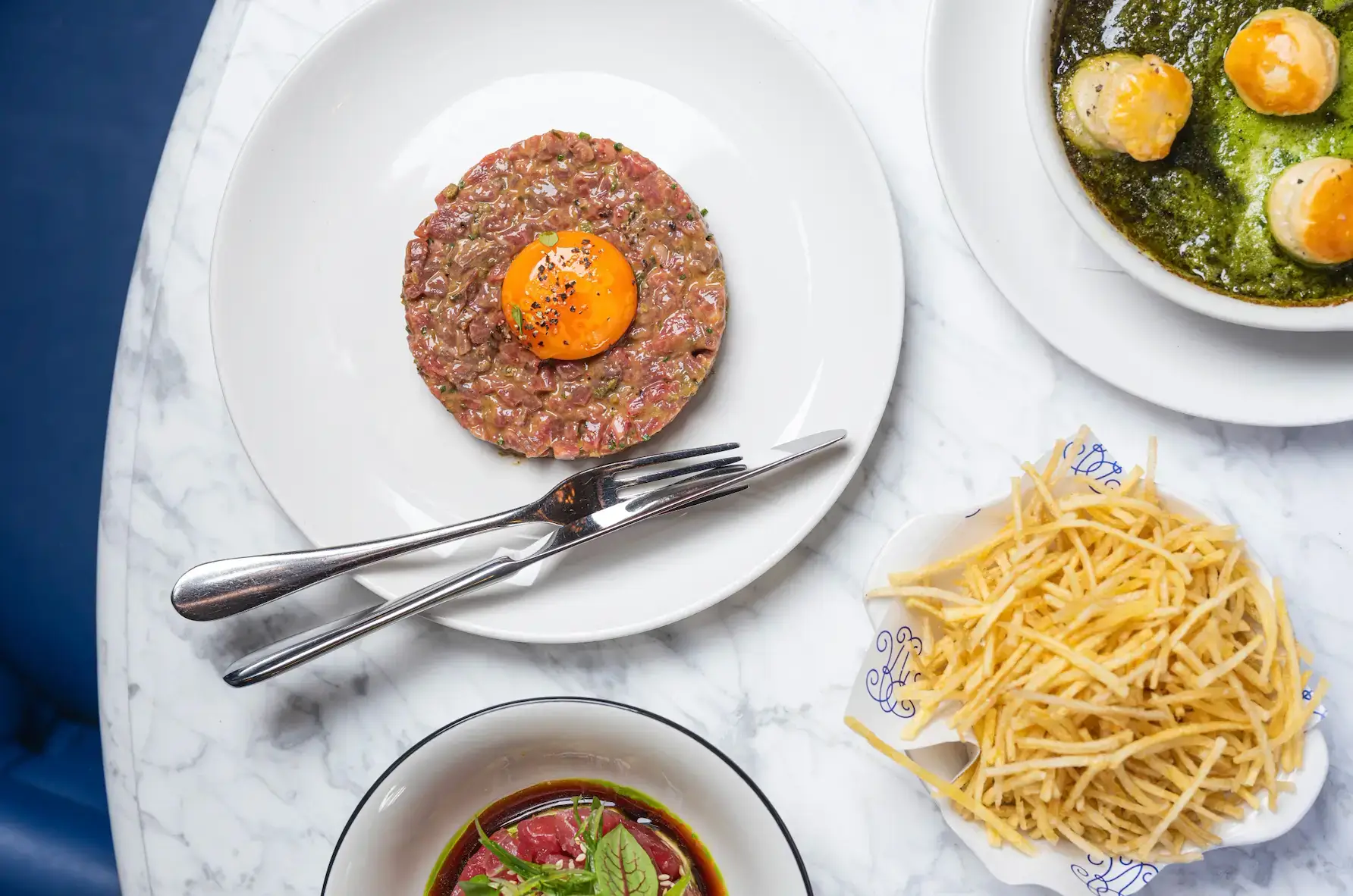 On their all-day menu, kick things off with classic starters like French onion soup, beef tartare, yellowtail carpaccio, Burgundy snails, and truffle Croque Monsieur.