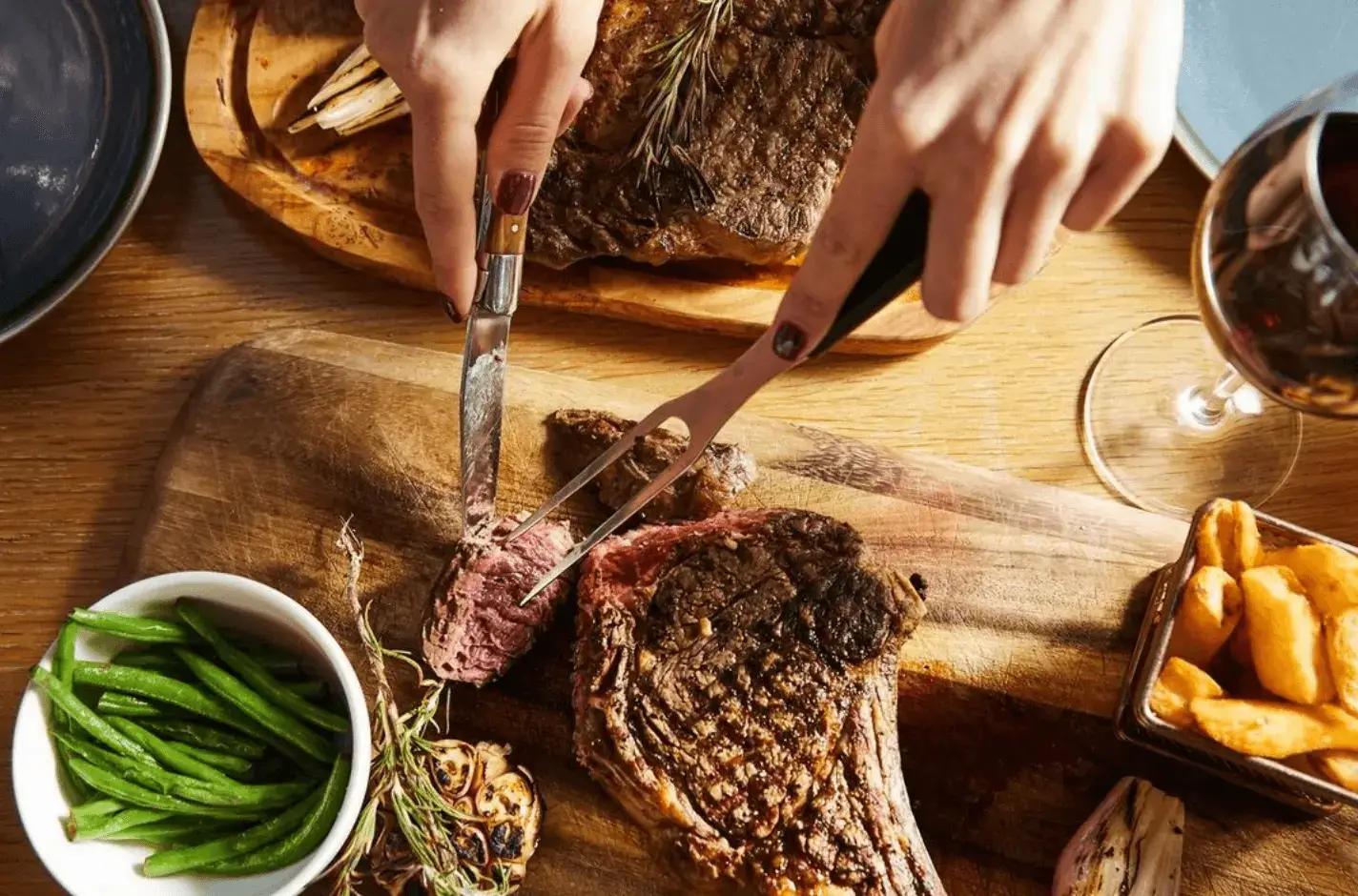 The menu features a wide range of seasonal British dishes including steaks, fresh seafood, salads, and sides.
