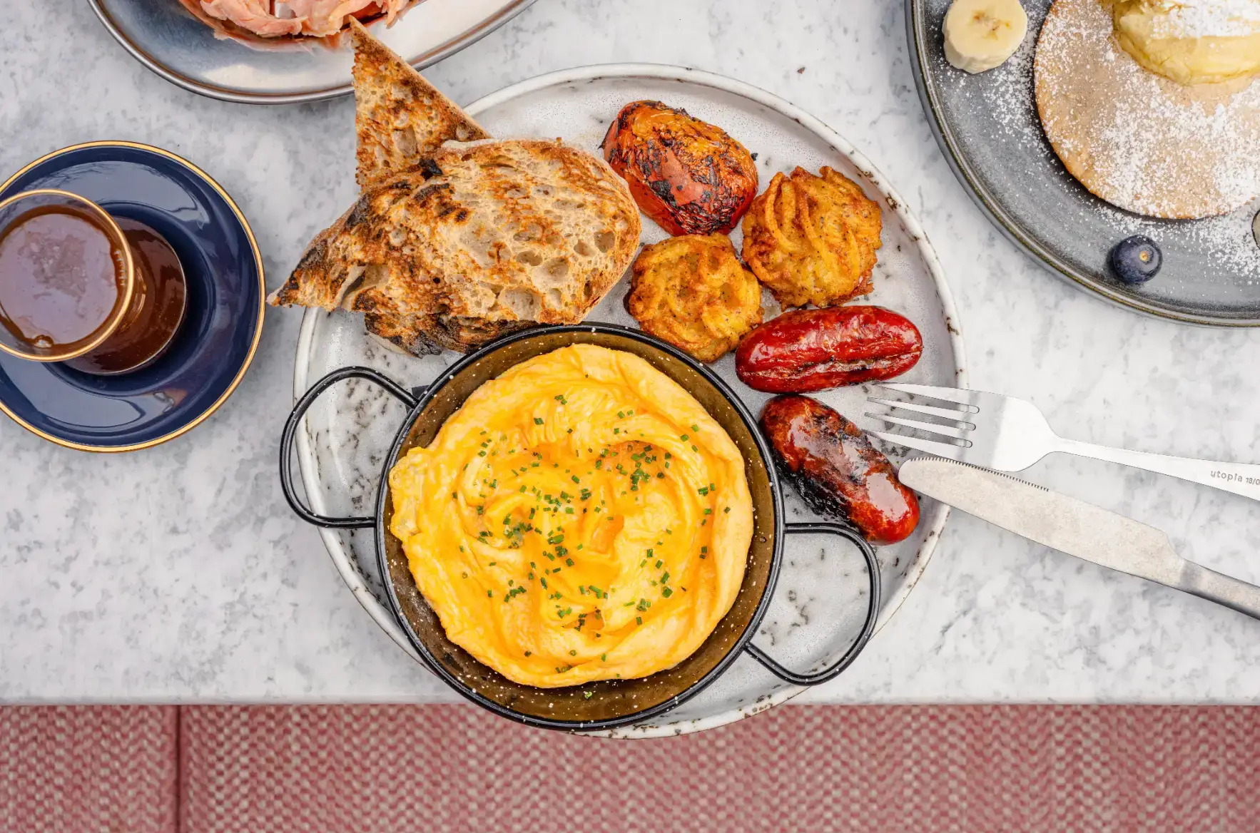 Start the day with breakfast spreads including shakshouka, treacle-glazed bacon & eggs, avocado & harissa feta on toast and banana pancakes.