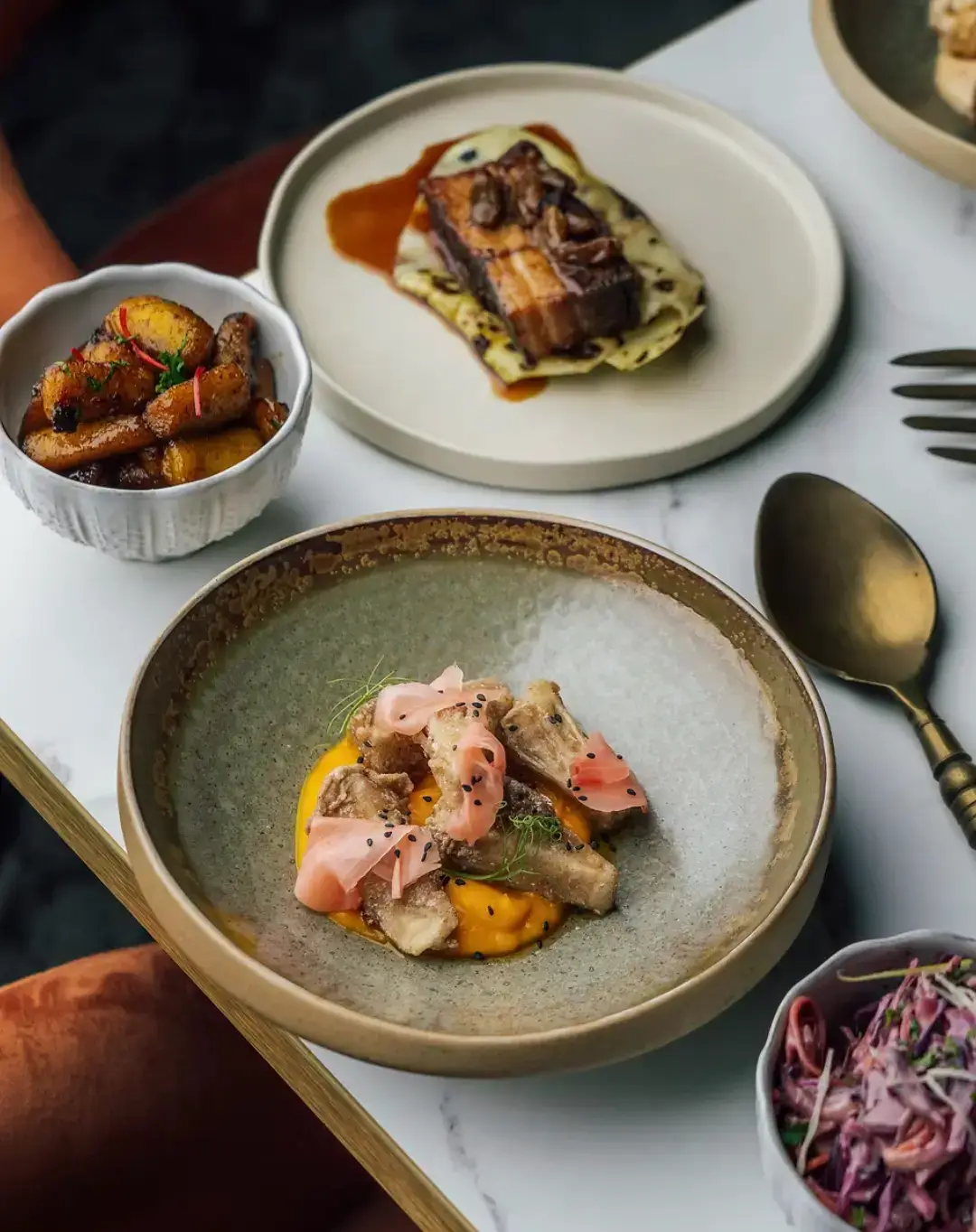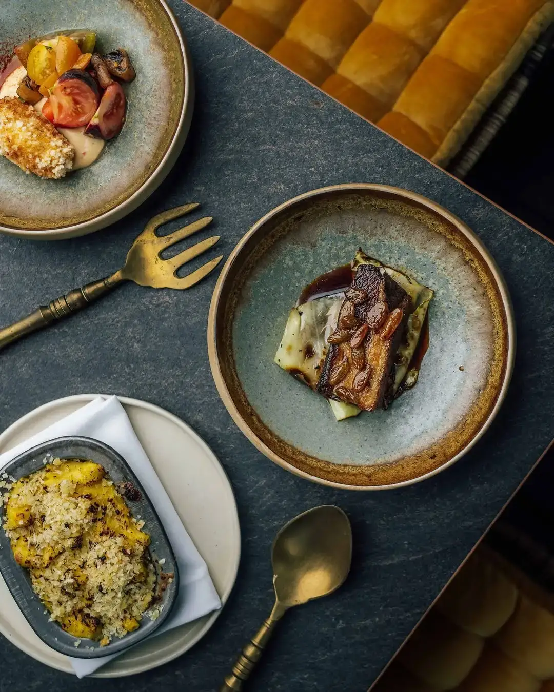 On the mains, you'll find rum + raisin glazed pork belly, crispy banana blossom coconut curry, red mullet, short rib brown stew, and a seafood boil with lobster tail, king prawns, soft-shell crab, and diver-caught scallop.