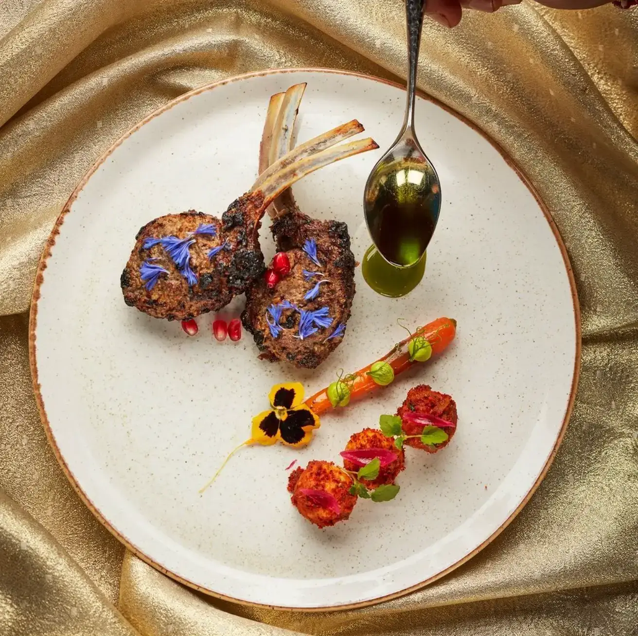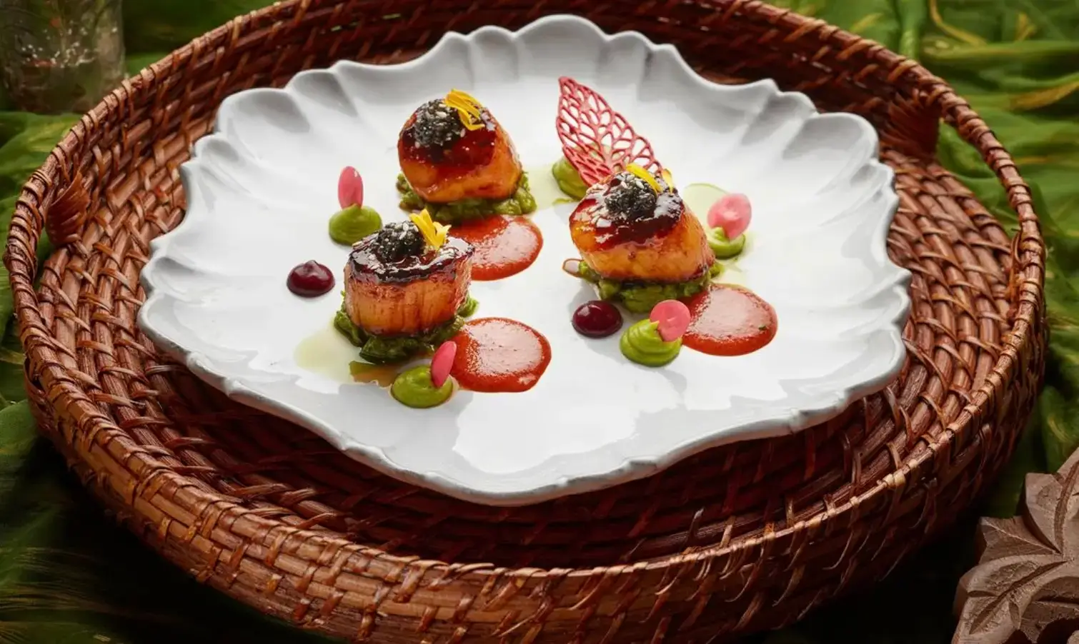 Begin with starters including grilled scallop with coconut butter, Herdwick spiced lamb chop, and calamari pepper fry with chilli passionfruit coulis & squid ink mayo.